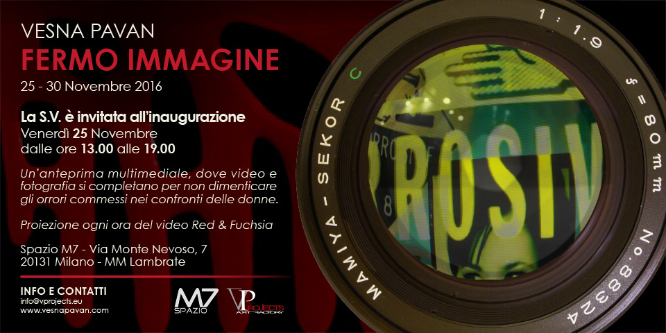 Venerdì 25 novembre 2016, in occasione della Giornata Mondiale Contro la Violenza sulle Donne, inaugurerà una mostra fotografica di sensibilizzazione sul tema, dal titolo "Fermo Immagine", che sarà aperta al pubblico dalle ore 13:00 alle ore 19:00 all'interno della galleria "Spazio M7", via Monte Nevoso 7, 20133 Milano (MM Lambrate). L'esposizione rimarrà in permanenza fino al 30 novembre 2016 e sarà visitabile solo su appuntamento.