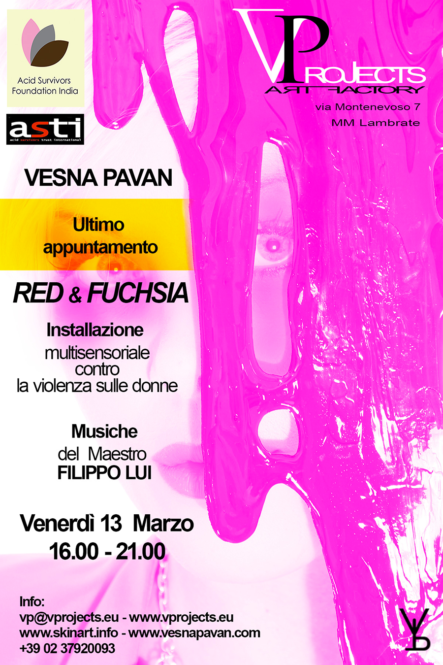 RED e FUCHSIA è un progetto artistico di sensibilizzazione sul tema della violenza nei confronti delle donne. Consiste in una mostra d’arte itinerante che partirà dall’Italia per concludersi in India. Lo scopo e quello di raccogliere fondi attraverso delle aste appositamente organizzate nei vari luoghi e paesi toccati da questa iniziativa, da devolvere alle associazioni Acid Survivors Trust International (ASTI) e Acid Survivors Foundation India (ASFI) che assistono e curano costantemente le vittime di queste violenze.